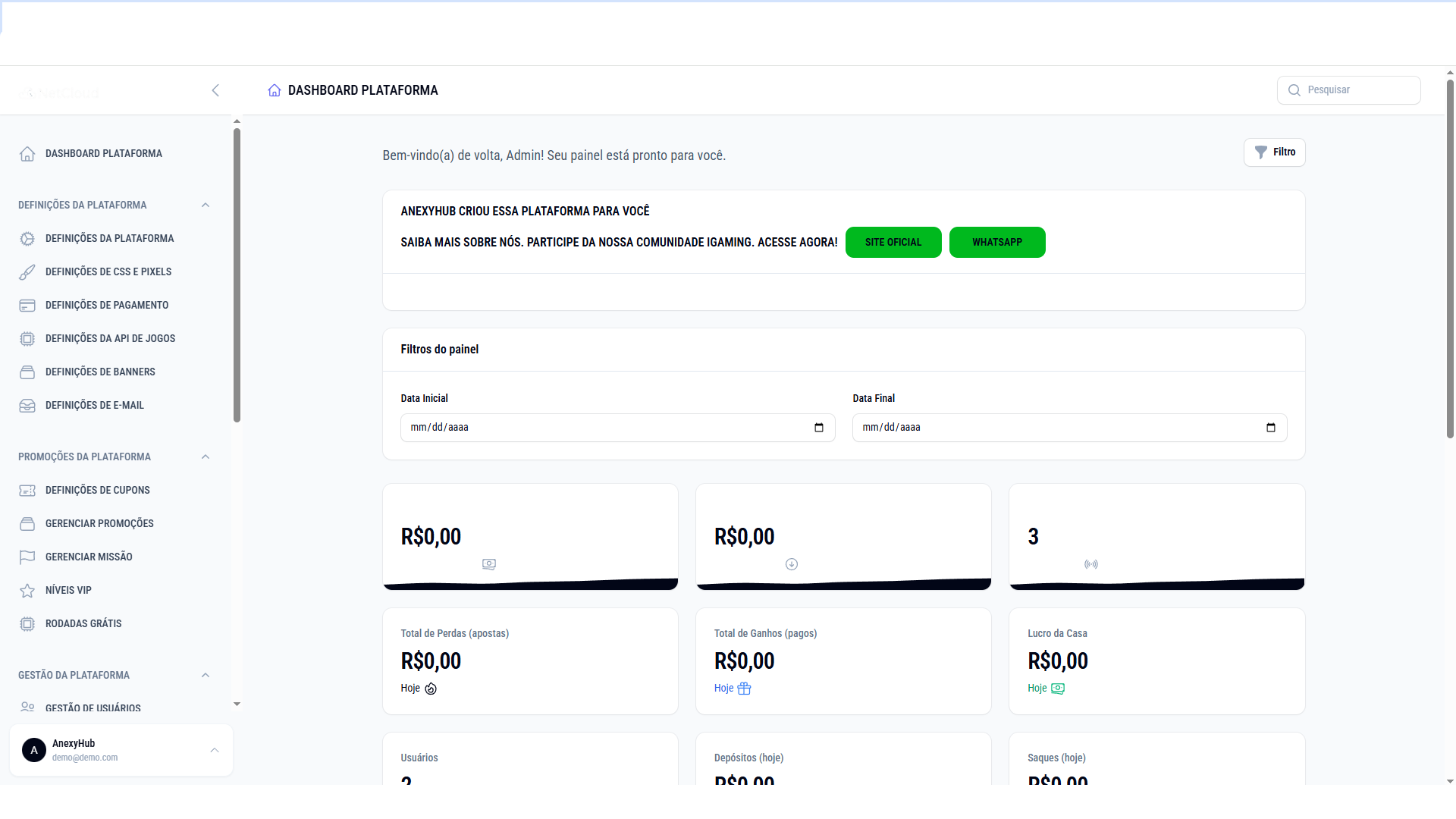 - Painel Admin Intuitivo: Gestão total de usuários, depósitos e configurações.